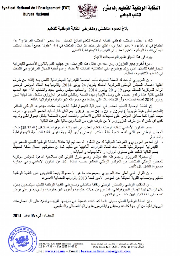 تداول أعضاء المكتب الوطني للنقابة الوطنية للتعليم البلاغ الصادر عما يسمى “المكتب المركزي” عن اجتماع في الرباط يوم 3 نونبر الجار، واطلع على جديد الترهات والمتمثلة في قرار “طرد” جميع أعضاء المكتب الوطني للنقابة الوطنية للتعليم العضو في الفيدرالية الديمقراطية للشغل .
