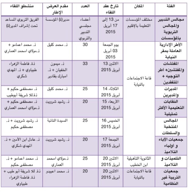 ترأست جميع اللقاءات السيدة سومية ابن عبو نائبة الوزارة حيث رحبت في معرض كلمتها بكافة المشاركين من فاعلين تربويين والشركاء مذكرة بالهدف العام من هذه اللقاءات والذي يروم خلق فضاءات للتقاسم والتفاعل حول التدابير ذات الأولوية وإغنائها والتي تندرج ضمن سياق متكامل بتنسيق تام مع المجلس الأعلى للتربية والتكوين والبحث العلمي في أفق بلورة المشروع التربوي المنشود، مشيرة في نفس الآن إلى اللقاءات التشاورية التي نظمتها النيابة الإقليمية السنة الماضية والمشاركة الوازنة والنوعية لكافة المتدخلين في القطاع والتي أثمرت تدابير ذات أولوية سيتم إغناؤها بإسهامات الجميع وفق مقاربة تشاركية وتشاورية.