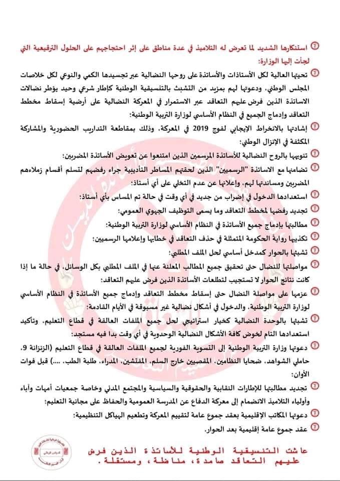 يذكر أن مختلف المديريات الإقليمية شرعت في فتح باب التقدم بطلبات لشغل مناصب المضربين، كما أصدرت الوزارة مذكرة في هذا الباب، كما باشر العديد من مديري المؤسسات عمليات الضم و تغيير البنية التربوية.