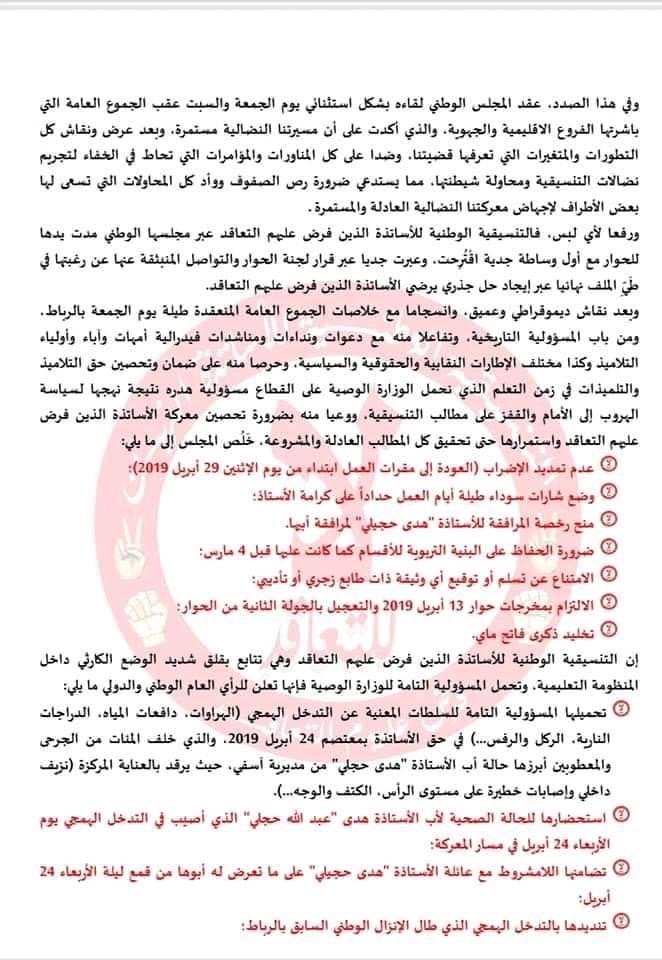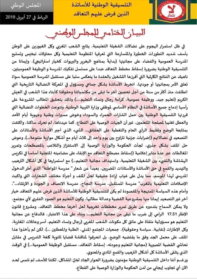 بتصويت 62 تمثيلية و معارضة 11، تأكد تعليق المجلس الوطني للأساتذة الذين فرض عليهم التعاقد للإضراب الذي دام لشهر و نصف، و ينتظر بهذا القرار عودة الأساتذة إلى استئناف عملهم يوم الاثنين 29 أبريل لإتاحة الفرصة للحوار مع الوزارة.