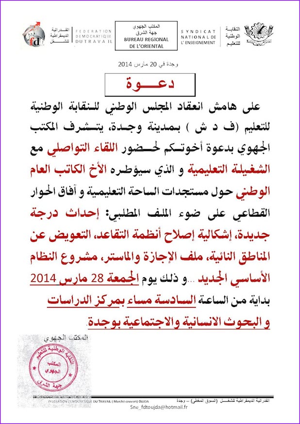على هامش انعقاد المجلس الوطنـي للــنقـابة الوطنية للتعليم (ف د ش ) بـمـدينة وجـدة، يتـــشرف المكتب الجهوي بدعوة أخوتـكم لحضور اللــقـاء التواصلي مع الشـغـيلـــة التعليمية و الــــذي سيؤطـره الأخ الكاتب الوطني حول مسـتجدات الساحـة التعليمــية ،وأفـاق الحوار القطاعي على ضوء الملف المطلـبي: إحداث درجة جديدة، إشكالية إصلاح أنظمة التقاعد، التعويض عن المناطق النائية، ملف الإجازة والماستر، مشروع النظام الأساسي الجديد …