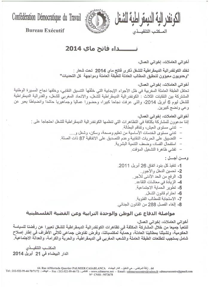 الاتحاد العام للشغالين بالمغرب يخرج في مسيرة 6 أبريل 2014