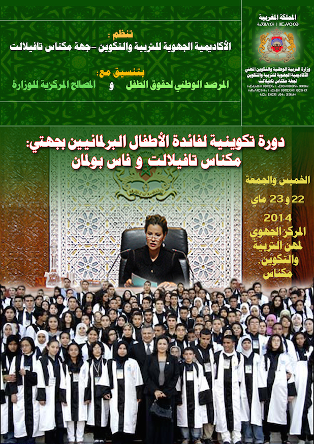 تنظم الأكاديمية الجهوية للتربية والتكوين لجهة مكناس تافيلالت، بتنسيق مع المرصد الوطني لحقوق الإنسان و المصالح المركزية للوزارة، دورة تكوينية لفائدة الأطفال البرلمانيين بجهتي مكناس تافيلالت وفاس بولمان، وذلك يومي 22 و 23 ماي 2014 بالمركز الجهوي لمهن التربية والتكوين بمكناس.