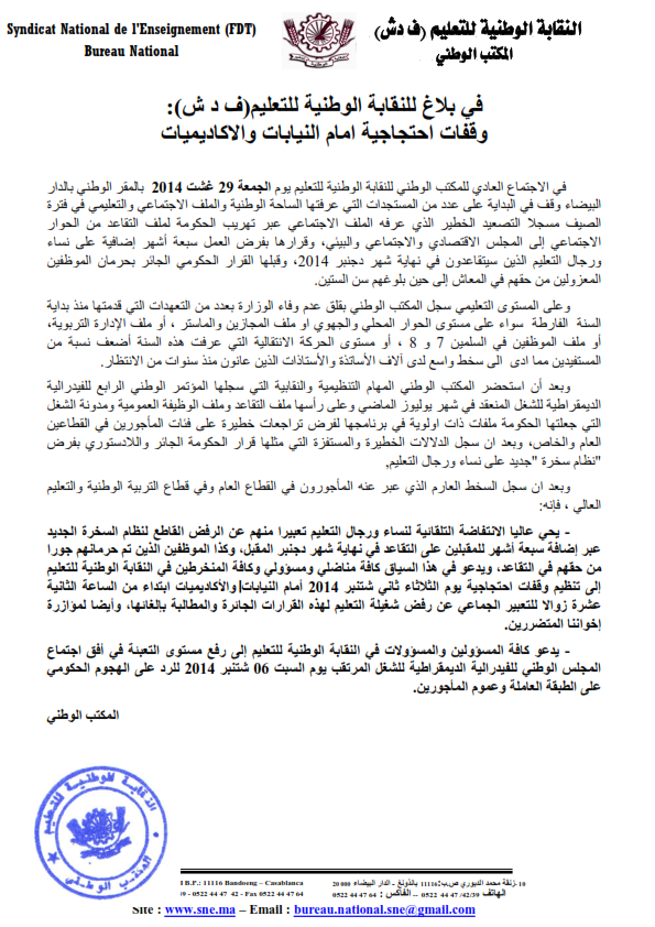 في بلاغ المكتب الوطني للنقابة الوطنية للتعليم ف د ش : وقفات أمام النيابات أو الاكاديميات