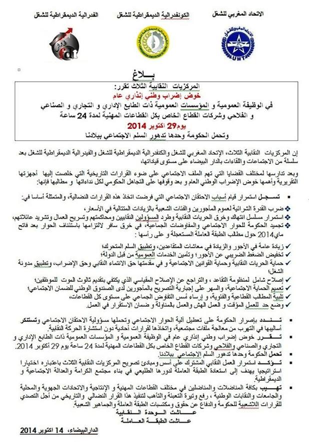 المركزيات النقابية الثلاث تقرر: خوض إضراب وطني إنذاري عام في الوظيفة العمومية و المؤسسات العمومية ذات الطابع الإداري و التجاري و الصناعي و الفلاحي وشركات القطاع الخاص بكل القطاعات المهنية لمدة 24 ساعةيوم 29 اكتوبر 2014 وتحمل الحكومة وحدها تدهور السلم الاجتماعي ببلادنا…