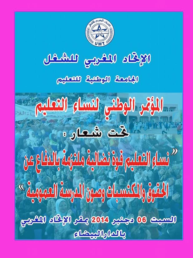 عقد الجامعة الوطنية للتعليم المنضوية تحت لواء الإتحاد المغربي للشغل مؤتمرها الوطني “تحت شعار: : ” نساء التعليم قوة نضالية ملتزمة بالدفاع عن الحقوق والمكتسبات وصون المدرسة العمومية وذلك يوم السبت 6 دجنبر 2014 بالمقر المركزي بالدارالبيضاء ، وينعقد هذا المؤتمر في ضل هذه المتغيرات التي تعرفها الساحة التعليمية وكذا الاجهاز على مجموعة من المكتسبات مما يجعل هذا المؤتمر محطة نضالية اخرى لتقوية صفوف نساء التعليم والخروج بتوصيات تضمن حق الكرامة وصون المكتسبات، كما ان هذا المؤتمر هو ملتقى نساء التعليم من كل مناطق المغرب حيت سيعرف مشاركة مكثفة لمناضلات الجامعة