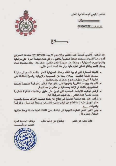 بلاغ المكتب الاقليمي للجامعة الحرة للتعليم بوزان