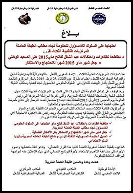 توصَّل موقع “المُدرِّس ببلاغ صادر عن النقابات الثلاث الاتحاد المغربي للشغل والكونفدرالية الديمقراطية للشغل والفيدرالية الديمقراطية للشغل، توضح فيه هذه المركزيات احتجاجها ضدا على السلوك اللامسؤول للحكومة اتجاه مطالب الطبقة العاملة، حيث تقرر بعد الاجتماع الطارئ صباح اليوم الثلاثاء 28 أبريل 2015 مقاطعة تظاهرات واحتفالات عيد الشغل فاتح ماي وجعل هذا الشهر للاحتجاج والاستنكار بكل اللشكال النضالية وتحميل الحكومة المسؤولية الكاملة في تردي أوضاع الطبقة العاملة المغربية وتهديد السلم الاجتماعي..